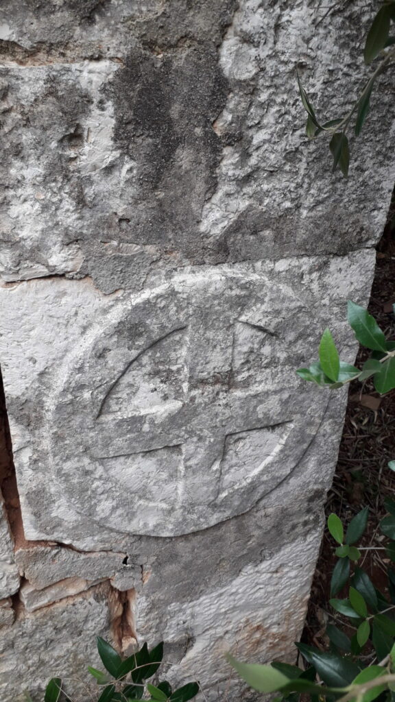 La croce greca inscritta in un cerchio, scolpita in un blocco di pietra sul muro perimetrale della "Chiesa delle Stelle" di Mola
